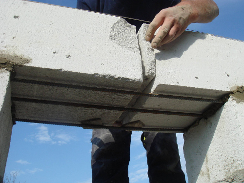 Після затвердіння залізобетонної перемички (а це від 3 до 5 днів в залежності від погоди) розбирається опалубка, якщо вона заважає кладці наступних рядів. Нам довелося розібрати опалубку через кілька днів, так як необхідно було продовжити будівництво. Втім, необхідність в опалубці відпала: бетон добре схопився, перемичка була готова.